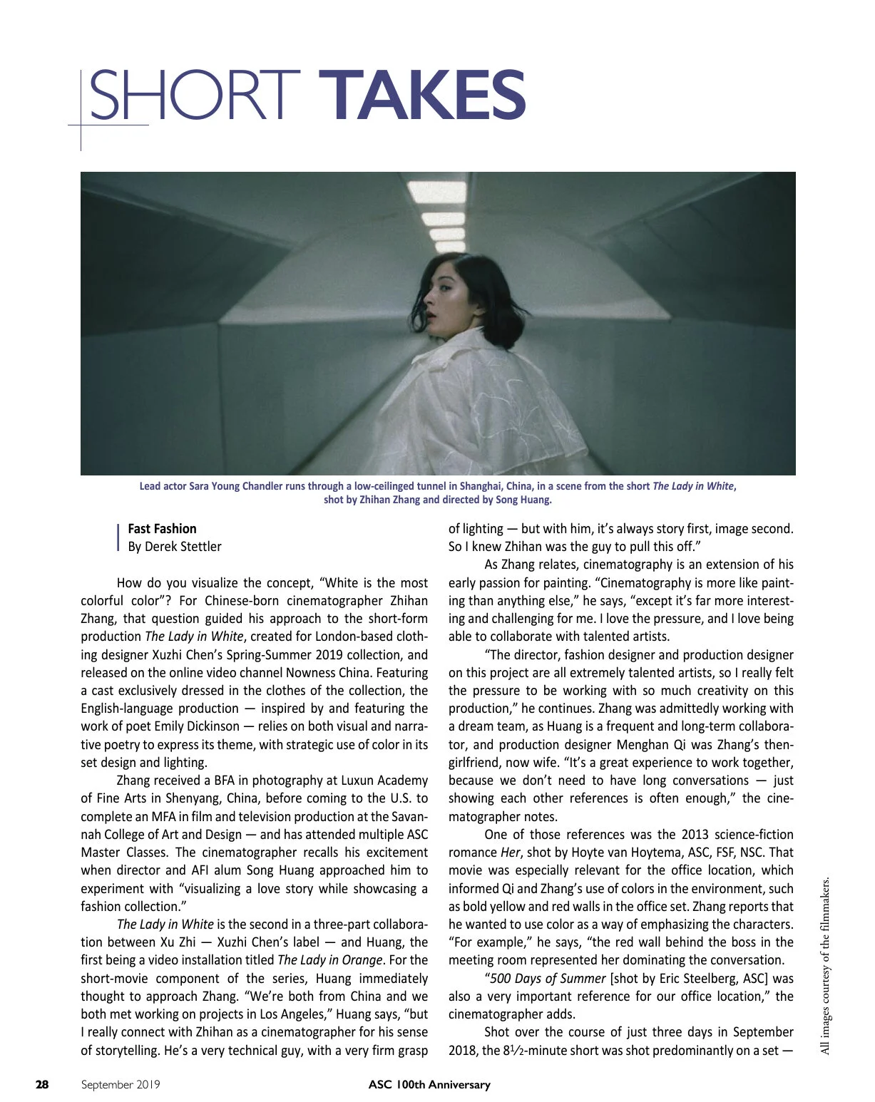 The Lady In White is selected to feature in Short Takes Section of American Cinematographer magazine September Issue in 2019 at ASC 100th Anniversary. This is the first Chinese production, and Zhihan Zhang is the first Chinese cinematographer featuring in American Cinematographer. Zhihan shares some insights and skills in the article.